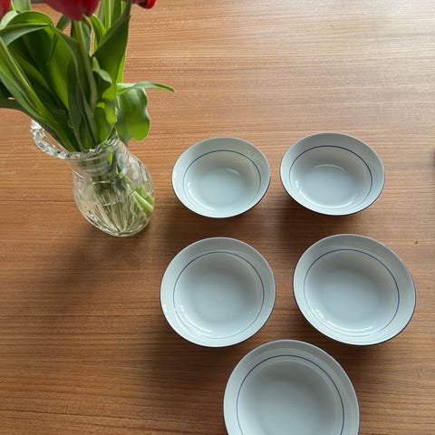 Porcelæn, Skåle, Hvide ”lotusskåle”, 12 stk. Højde 5,5 cm, dia. 12 cm. Lillebitte skår (1 mm) i kanten på en af skålene.