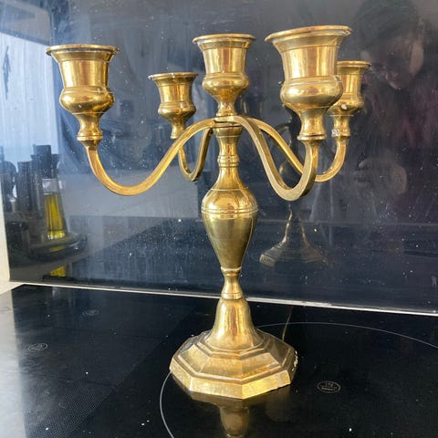 Lysestage, Stor elegant 6 armet lysestage / kandelaber i sølvfarvet messing. God stand, med en del patina.