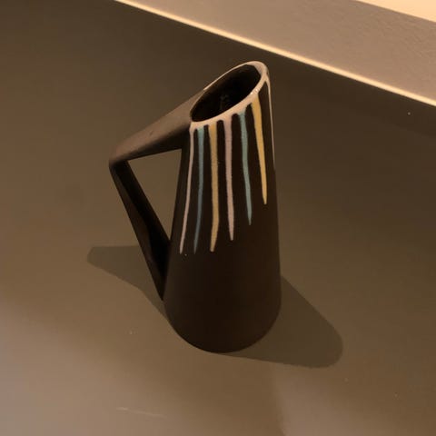 Høj, slank kande fra Søholm, Bornholm. Måler ca. 26 cm i højden. Desværre har hanken en limning – og der er en fejl ved foden, så det må være 2. sortering. Men flot og dekorativ alligevel...