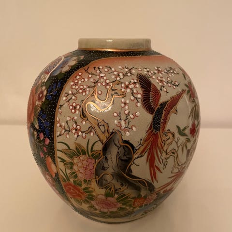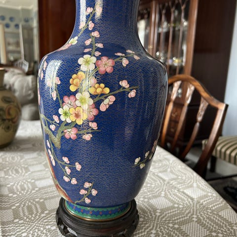 Dynasti Vase, Kinesisk vase, Stor Super flot kinesisk krukke. H 85 cm Bredde 35. Vasen/krukken er mere end 70 år gammel. Vasen er udformet i div blomstrede farver med azur grønne hængsler. Anskaffet i 1966. Passer perfekt til stue, entré eller hall.