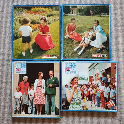 Kongeligt motiv, Træpuslespil, puslespil, Gammelt puslespil fra starten af 1940’erne med det daværende kronprinsepar Frederik og Ingrid og prinsesse Margrethe