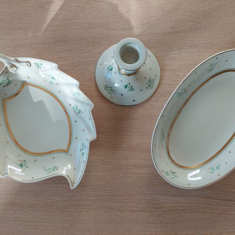 Har 2 sæt og endvidere 8 stk små flade skåle der kan bruges til bloklys i samme design.