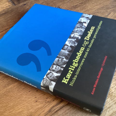 Kærligheden og døden, Anne Wolden-Ræthinge (1929-2016), genre: anden kategori, Pseudonym ”Ninka” – Ninka-interviews med 40 danske personligheder. Gyldendal 2004. 1.udgave, 1.oplag, 345 sider, illustreret med sort/hvide fotos af de 40 personligheder som fremgår af billedet under indhold, med forord af Connie Hedegaard f.1960, tidligere ministre og EU- kommissær, hardback, med smudsomslag, format 25,5 x 22 x3,7 cm, vægt 1,2 kg, som ny. Sender gerne