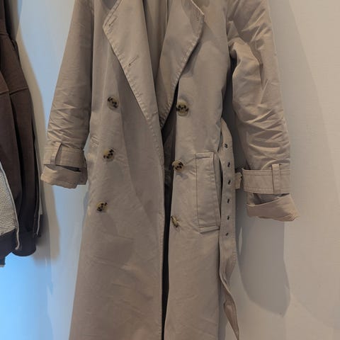 Rosa med sandfarvet stof i nakken, under kraven indvendig i ærmeåbninger og lommer.