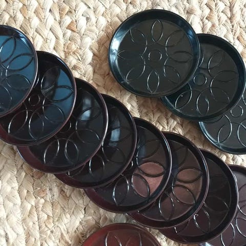 Store flaskebakker i bakelit, fra Illum, 4 flotte, sorte, store, ø 13 cm, flaske bakker eller coasters i bakelit.