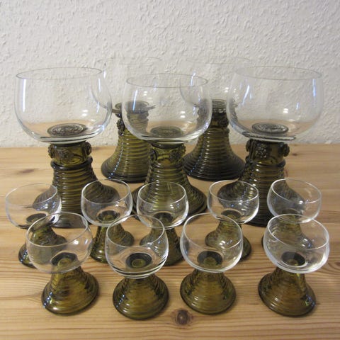 Vintage franske Rømmer glas med grøn fod, Krystal, 50 år gl.