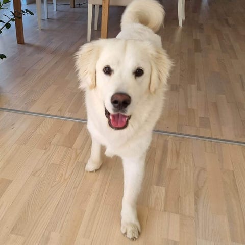 Han er en blanding af en Samojed og Golden Retriever, er født den 29. april 2022.