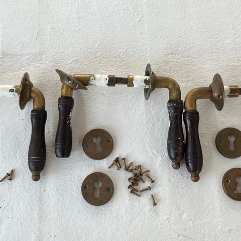 Gl.dørhåndtag virker, Fransk LANDSTIL, nips, patina, nyt og gammelt.