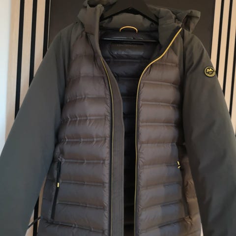 Funktionel parka jakke med hætte. Jakken har flere lommer, der lukkes med lynlås, samt vindstopfunktion i ærmerne. Jakken lukkes med lynlås skjult af en knappestolpe med trykknapper. Foret kan lynes af, så det kan bruges som en let jakke.
