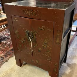 Hængeskab, b: 62 d: 32 h: 88, Antikt sydkinesisk hængeskab med låger i blå lapis lazuli lak med guldbelægning. Dekoration i forhøjet guld, grøn og rød lak eller emalje. Fremstår med fejl og mangler.