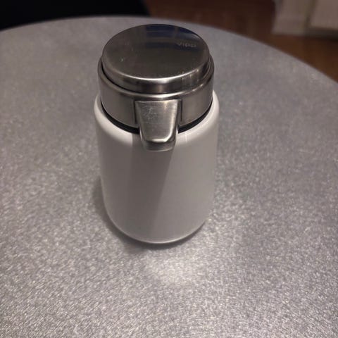 Sæbedispenser, Vipp, Hvid sæbedispenser m lille emaljefejl- se på foto.