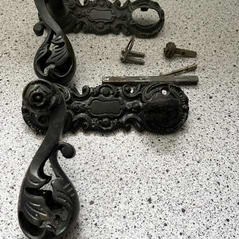Dørhåndtag, Støbejern/zink2, Antikt støbejerns dørgreb som jeg tror der er en Zink belægning på. Der er afslag nogle stedet men meget smukt er det. Sender gerne på købers regning
