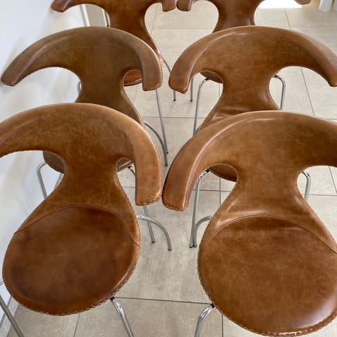 Spisebordsstol, Okselæder, Stella, Har disse fire stole i ægte okselæder med rustfrie ben, de er ikke brugt særligt meget dog da jeg flytter og kommer til at skulle have et andet bord til flere personer, så vælger jeg at købe nye stole og disse bliver sat til salg, de fejler intet.