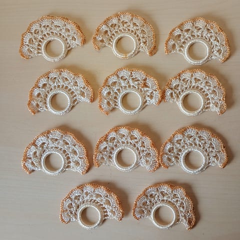 SOLGT : Servietringe hækkede i gult garn. 10 i pæn stand og to med starin på.