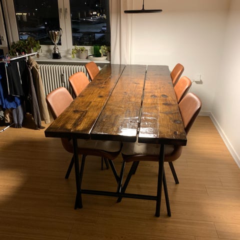 Ikke massiv træ, men beklædt med 2 mm egetræs-finer. 160*80 cm.