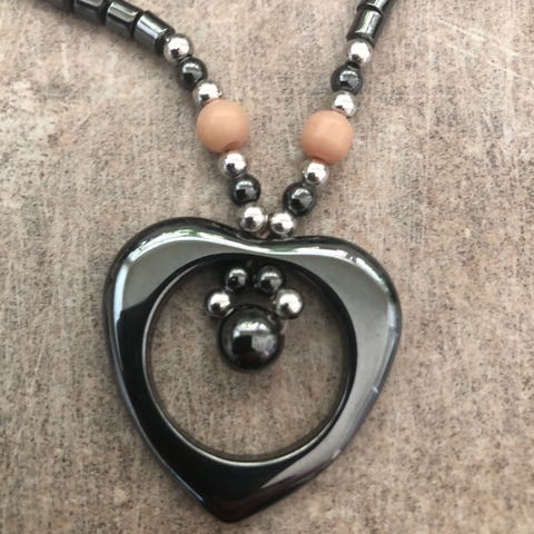 Halskæde, halvædelsten, Rosen-krans, Rosen-krans med Hæmatit-perler ( Blodsten) ogsølv-farvet Kors og Ave Maria vedhæng