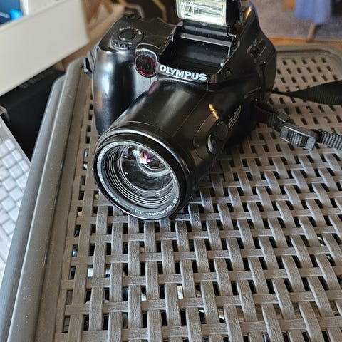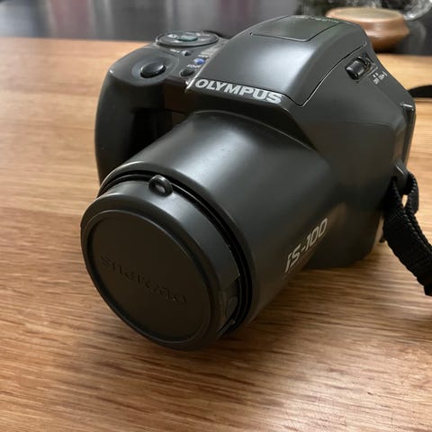 Andet, Olympus IS2000, God, Et Fuldt funktionel 35 mm peg og skyd kamera med autospol/tilbagespoling, autofokus (som kan ses i din søger, når den er i fokus), en indbygget højeffekt pop-up flash, en selvudløser, kvarts dato og en ƒ.4.5-5.6 35 -135 mm objektiv.