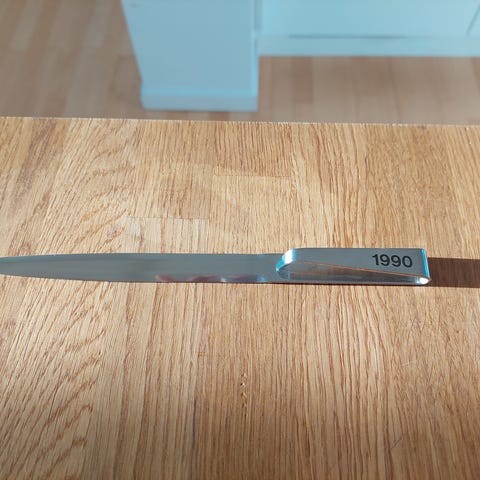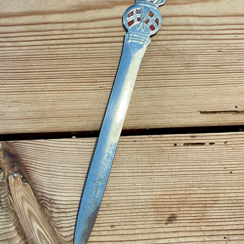 Brevåbner i sølv og rav celluloid med hundehoved i sølv fremstillet af Hugo Grün.