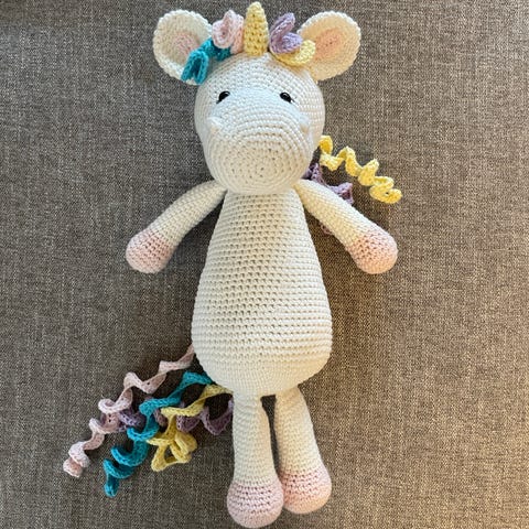 Hæklet enhjørning, kunsthåndværk, Nu kan man også bestille hæklede enhjørninger med horn og et væld af superflotte krøller, der bare gør enhjørningen så uimodståelig sød og flot. Enhjørningen måler ca. 30 cm og kan laves både i alskens ønskede farver samt i de andre størrelser, der matcher mine andre hæklede heste.