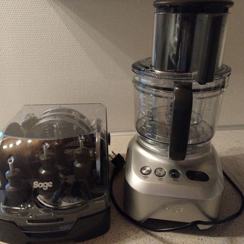 Foodprocessor, Sage, Rolls Roycen inden for køkkenmaskiner er Sage. Jeg sælger min foodprocessor derfra, da jeg får den brugt for lidt. Den er tiptop i orden og kan hakke, snitte, rive og skære i en uendelighed. Skålen rummer 3,7 liter. Den originale og komplette boks med tilbehør følger naturligvis med.
