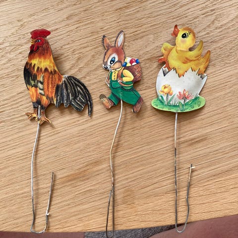 5 forskellige stykker påske pynt, Samlet pris på påske hare figur, 2 får og 2 krus/urtepotter begge har små afslag se billeder. Fine til forårs blomster og andet, eller til en stor kop te/kaffe. Sender gerne men køber betaler selv for en eventuel forsendelse.