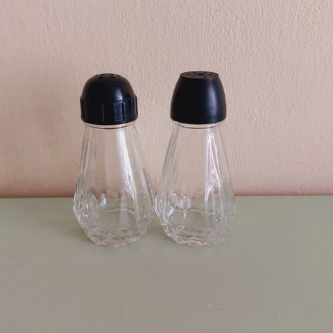 Andet, Vintage salt og pebersæt, Kommer formodentligt fra Tyskland. Sættet er 10 cm højt, 9,5 cm langt og 4,5 cm bredt. Der mangler låg på det ene glas og det andet låg er knækket. Prisen er sat herefter