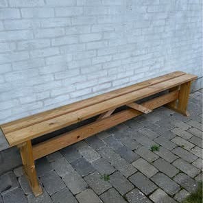 Træbænk i mørkebrun farve, velegnet til udendørs brug. Solid konstruktion med enkle linjer, der passer til forskellige havemiljøer. Perfekt til afslapning i haven eller på terrassen.