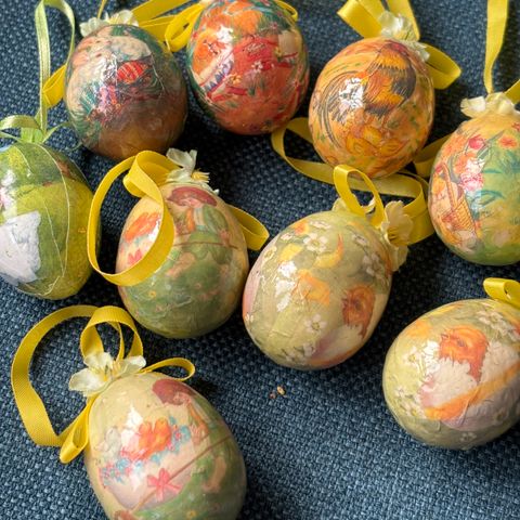 Påskepynt, påskeæg, påskeophæng, Ukendt, 6 fine dekopage æg med påskemotiver. På størrelse med et æg.