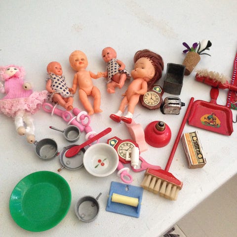 Store sække med dukker og tilbehør