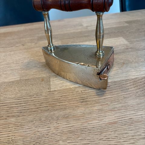 massiv messing med håndtag af træ.