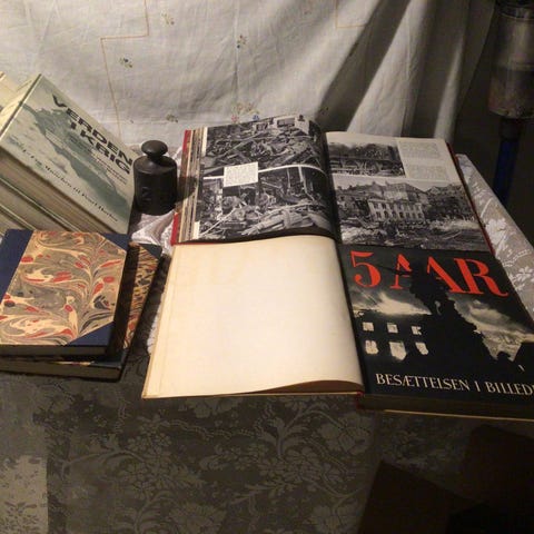 Bøger og blade, foto 1 + 2: sidste tog fra Berlin af Howard K. Smith - nordisk forlag 1943 (udgivet illegalt under krigen) / foto 1: April i Danmark af Poul Sørensen - en bog på vers fra 1942 / foto 3: vi skaber historie af Robert Ziller udgivet i England 1940 - i Danmark i 1945 med udtalelser af Hitler, Göring og Göbbels / samlet pris / sender gerne