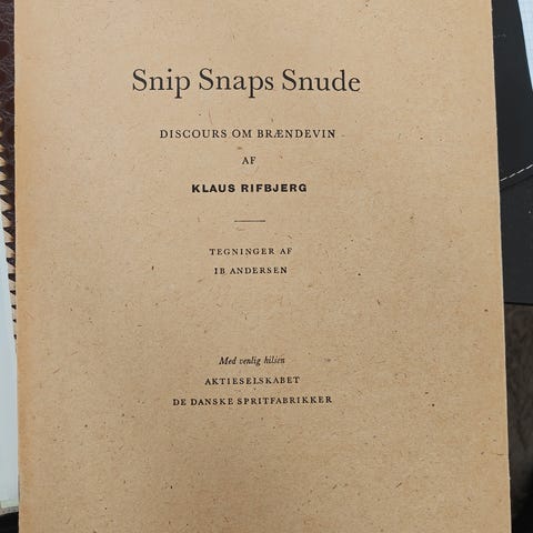 Snip snaps snude - Discours om brændevin, Klaus Rifbjerg, genre: anden kategori, Sjovt lille skrift, bestilt og udgivet af de Danske Spritfabrikker, med fine tegninger af Ib Hansen.
