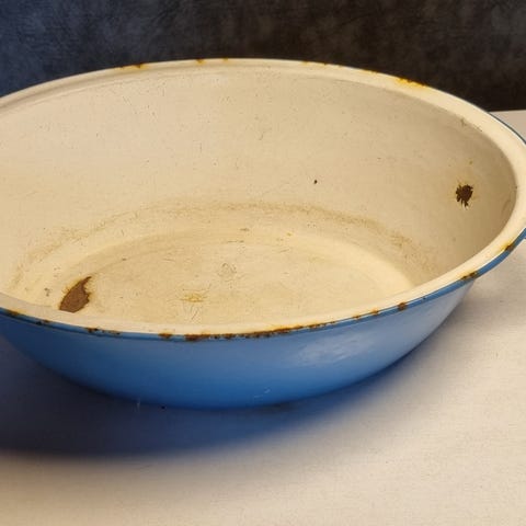 Andre samleobjekter, Madam Blå balje, Sjælden Madam Blå balje. Den er stor med en længde på 47 cm plus de to håndtag. Bredden er 36 cm og højden 14 cm. Det er Ingen huller i baljen men den har nogle aldersbetingede afslag i emaljen (se fotos). Superfin til blomster eller anden dekoration. Som taget ud af Matador. Står på Mols men kan gratis leveres I Aarhus og Ebeltoft eller sendes billigt på købers regning