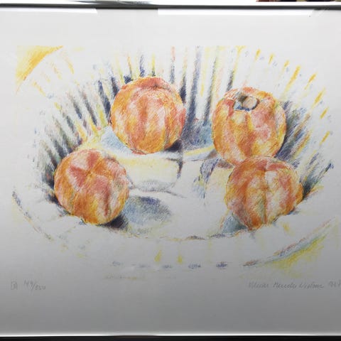 Offsettryk, Vibeke Mencke Nielsen, motiv: Citroner, Udstillingsplakat Billedværkstedet, b: 30 h: 42,3, Billedværkstedet i Brovst, udstillingsplakat. Udstilling med kunstneren Vibeke Mencke Nielsen.