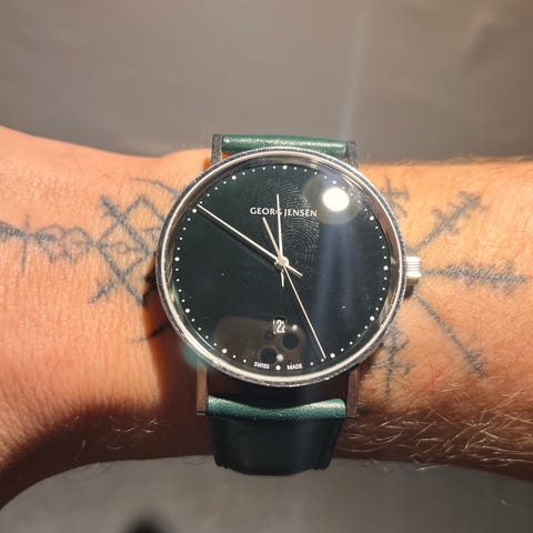 Georg Jensen herrearmbåndsur, jubilæumsmodel designet af Bo Bonfils. Sort Skive med logom arabertal og quartsværk. Rigtig fin stand