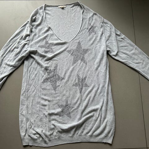 Sweater, Esprit, str. 38, Lyseblå/hvid, Bomuld, Den fineste pullover i smukke, sarte farver. Meget velholdt men har desværre fået en plamage bagpå (se billederne). Man kan eventuelt bruge den med en vest over, så pletterne ikke ses. Længde 57 cm. Brystvidde mellem cirka 94 og 106 cm, alt efter hvor meget man strækker trøjen.