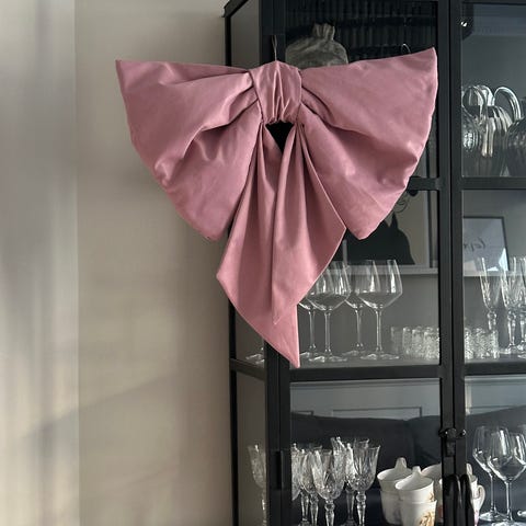 Håndsyet sløjfe, Fin håndsyet sløjfe af nyere bomuldsstof med hvid bændel til ophæng.