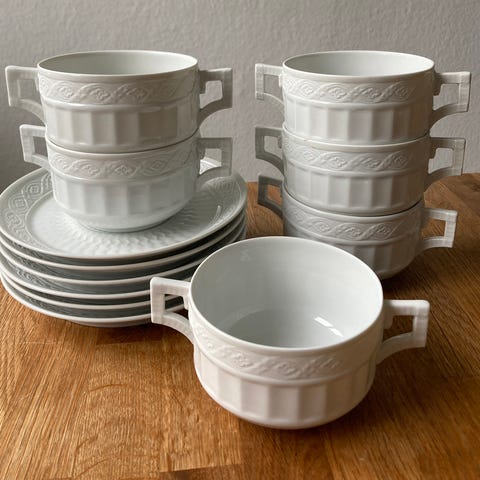 Bouillon kopper med låg. Hvid halvblonde, Royal Copenhagen, Seks flotte hvide halvblonde bouillon kopper med låg alle i I sorteringen og perfekt stand