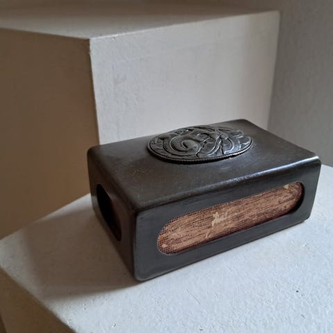 Æske/opbevaring, Tin, Pewter Haugrud, Norway er designeren bag denne håndlavede vintage tin æske med fire små ben og fine ormamenter.