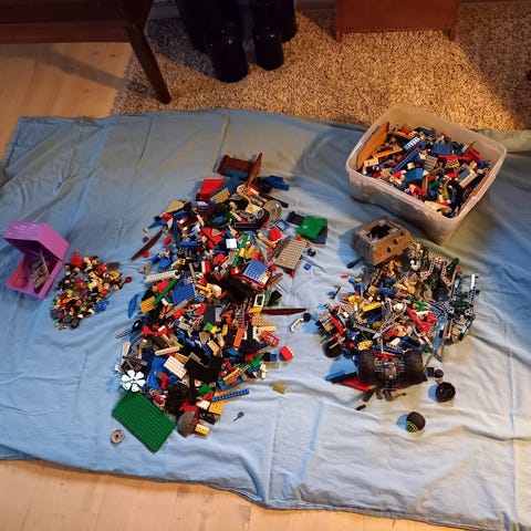 Lego blandet, Blandet Lego ligger samlet i en viste runde store bøtte og vejer 5 kg - der er også små figurer og andre små tilbehør ( se billedet )
