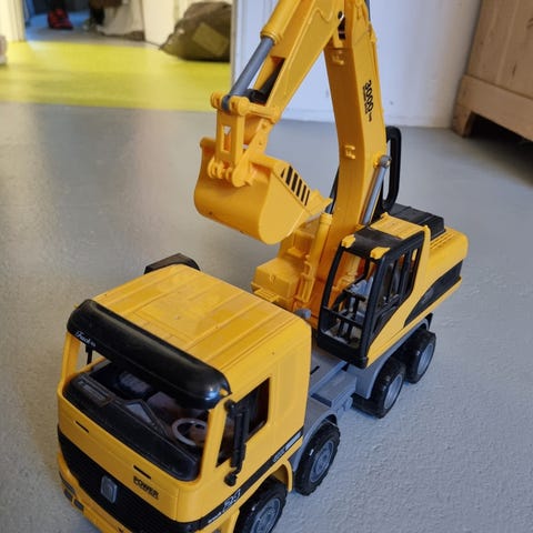 Lille retro gravemaskine med grab og vogn i rød plast.