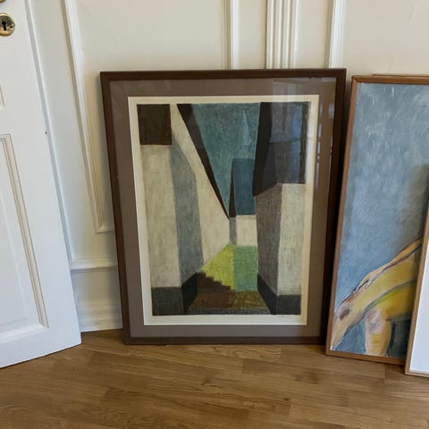 Litografi, Ukendt, motiv: Abstrakt, b: 29cm h: 34cm, Super smukt billede litografi i grønlige toner i fransk vintage ramme med struktur.