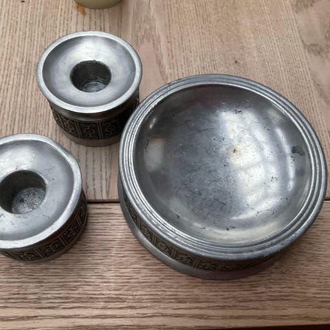 Jeg tror det er tin. Brug den fx til fyrfadslys som kammerstage.