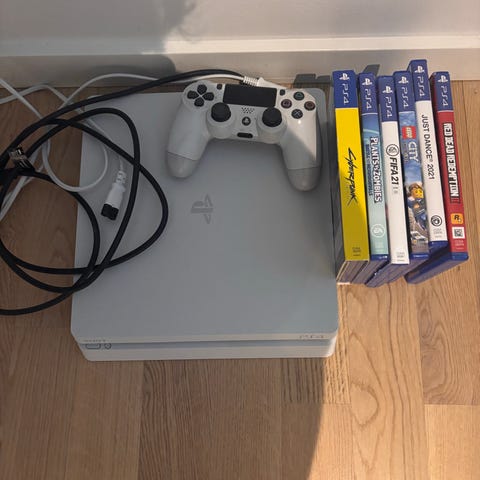 Playstation 4, God, 3 controllere med oplader medfølger. Dog driller r1 på 2 af dem. Mener den er på 500 GB. Strømforsygning og HDMI medfølger self også.