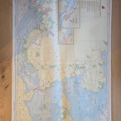 Søkort, Kort over farvandet syd for Fyn. Rudkøbing Løb. Af ældre dato. Meget dekorativt og historisk. I aluramme med plast. Både kort og ramme har aldersrelaterede brugsspor. Rammen måler ca. 60x80 cm. Sendes ikke.