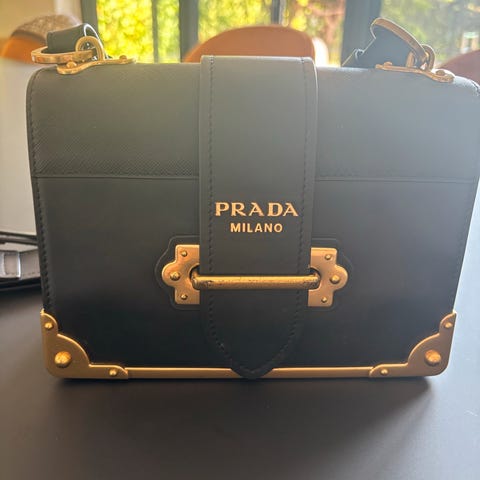 Mappe, Prada, Helt ny (ingen slitage) Prada mappe i fåreskind, fladt tophåndtag og foldover top med spændelukning og indvendige lommer. Der følger nøgle med. Den er købt i Pradas butik i Milano. Lille hak nederst i rykken (se billede, derfor sælges så billigt). Garantibevis følger (se billede). Oprindelig pris 22.000 kr.