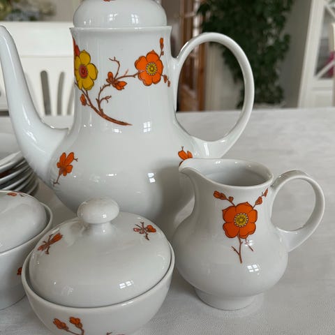 Porcelæn, Kaffestel, Arabia Kosmos, Retro stel fra finske Arabia "Kosmos" af Gunvor Olin- Gronqvist. Alt i perfekt stand, der er dog lidt skår på porcelænssien til tekande, se ikke og har ingen betydning for tebrygningen. Det er mix af brune og olivengrøn farver. Samlet pris, kan afhentes i Kalundborg.