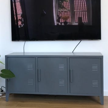 Andet produkt, metal, b: 119 d: 41 h: 63, TV-stereobænk / kommode , lakeret stål med 2 aflåselige låger samt to hylder.