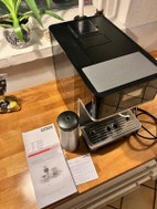 Der kan brygges med eller uden mælk og der er kværn for hele bønner. Er passet og plejet.