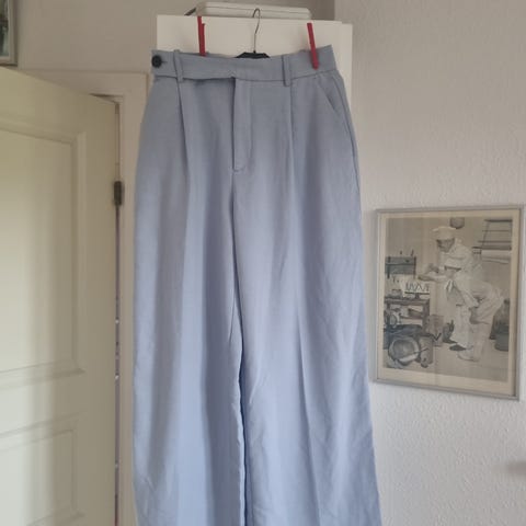 Blå bukser med hvid stribe i siden fra Zara, str. large, elastik i ryggen i linningen, snydelommer, kvaliteten er bomuld, polyester og elastan.